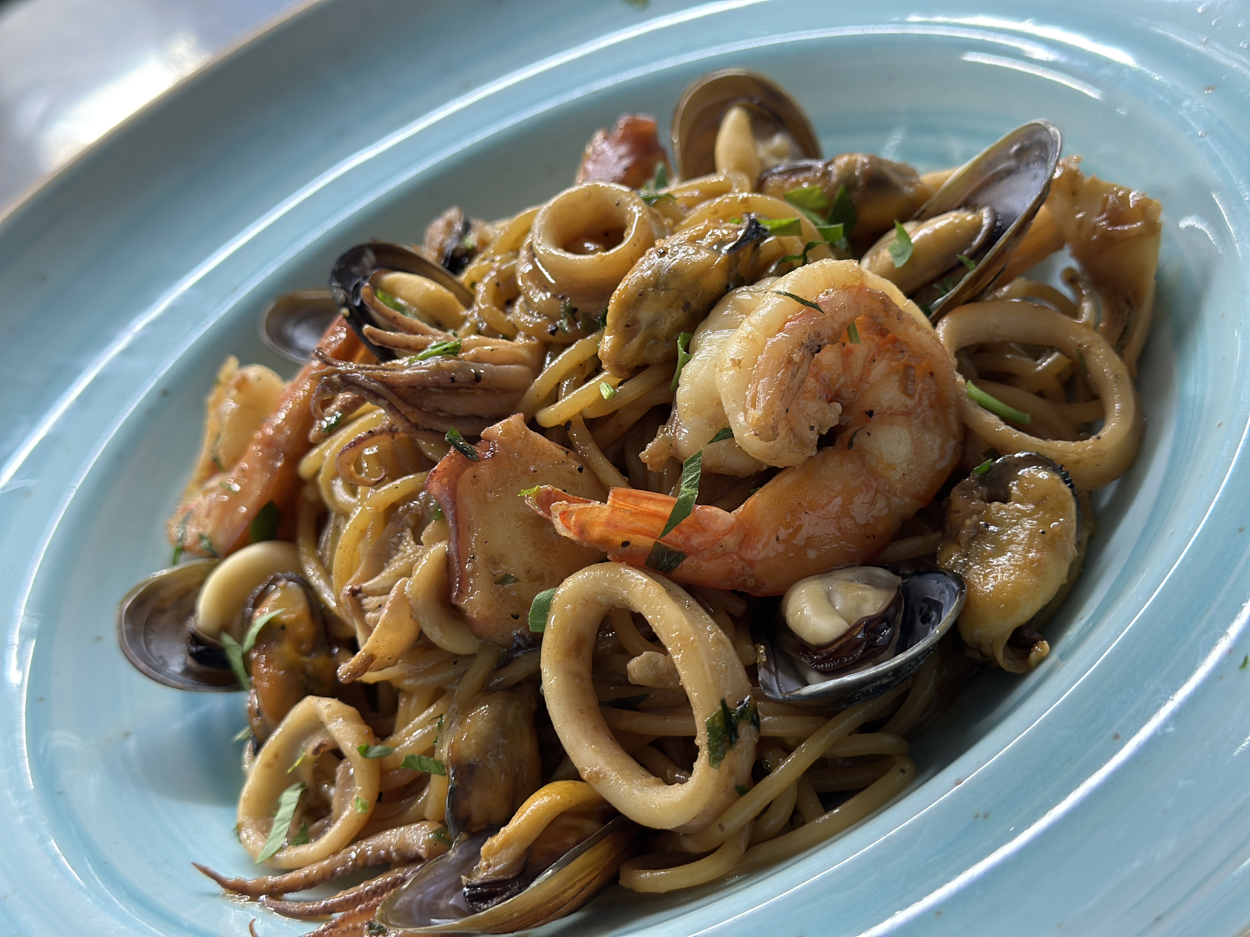 спагети, скариди, октопод, калмари, миди, терияки, соев сос