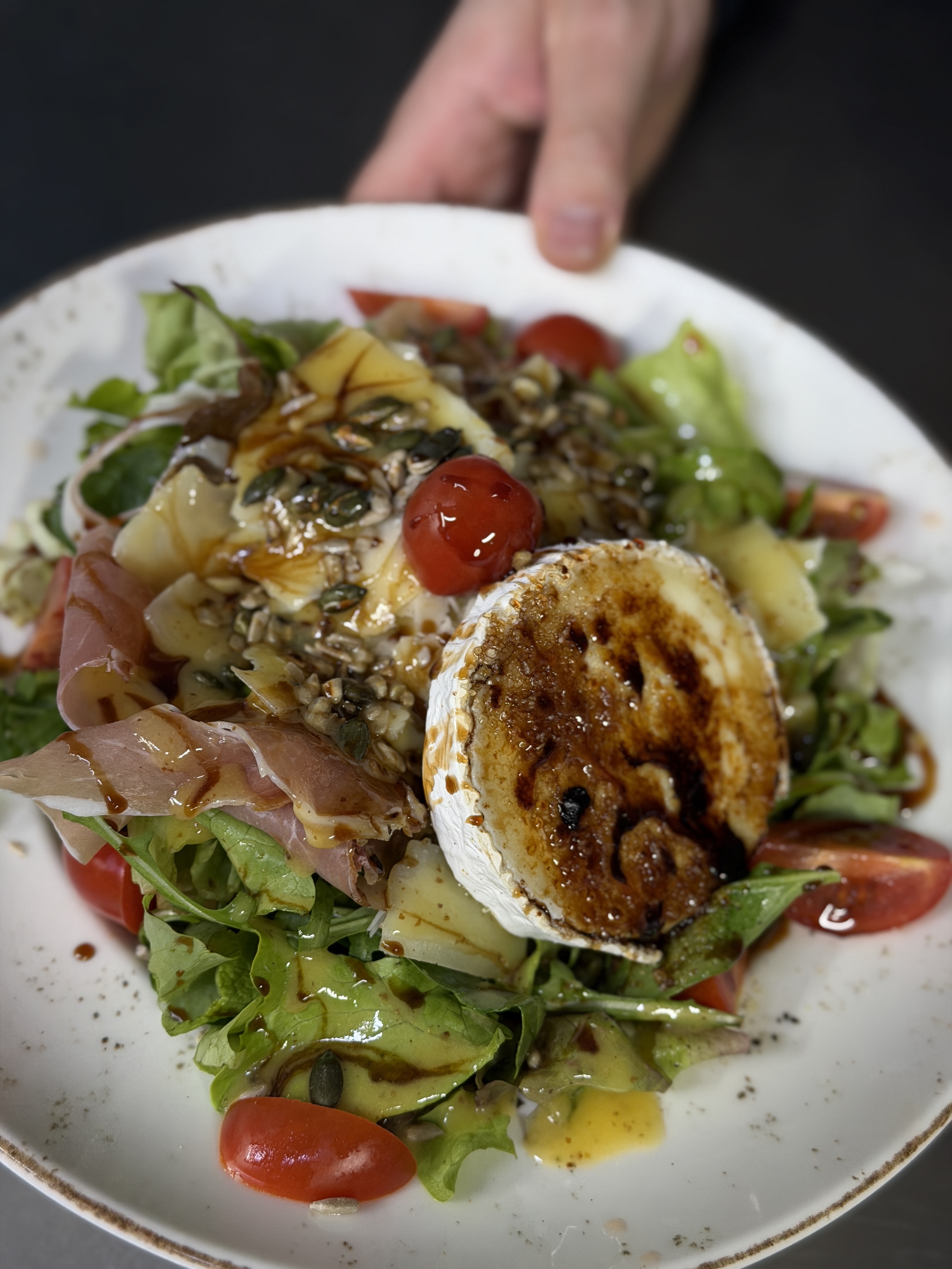 прошуто, свежо козе сирене, пармезан, микс от свежи зелени салати, чери домати, ядки, дресинг