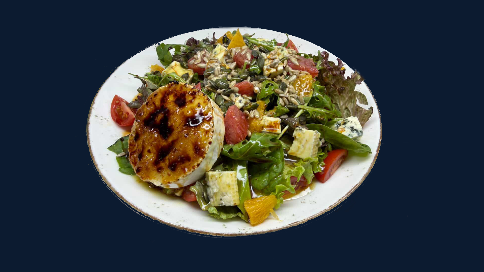 Микс от свежи зелени салати, свежо козе сирене, авокадо, ядки, грейпфрут, синьо сирене, балсамова редукция